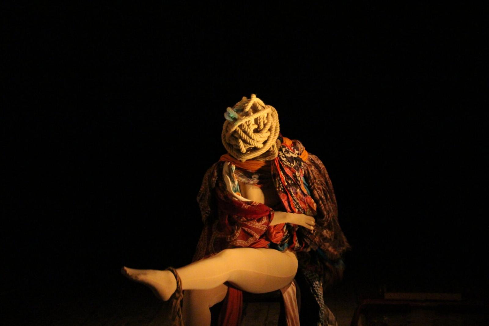 Sahnedeki beden, yüzünü dahi saran beyaz bir tulumun içinde neredeyse hareketsiz bir hâlde beliriyor. Canlı mı, cansız mı olduğu ilk anda ayırt edilemeyen, nefesi dahi görünmez kılınmış bir beden. Hareket, sahneye giren ikinci bir figürün bedenin ayak bileğine bağlı ipi çekmesiyle başlıyor. Akışkan değil, kesintili, aksayarak ve kontrol altında. Hareket ettikçe özgürleşmesini bekliyoruz, aksine “kozasından” çıktıktan sonra bedeninin üzerine bırakılan, sarılan, dolanan eşarplar giderek alanını daraltıyor. Arka planda yükselen kadın sesleri, sloganlar ve kalabalığın uğultusu, bu bedensel kuşatmayı İran’dan tanıdık bir direniş hafızasına bağlıyor. Beyaz tulumun altında nefessiz kalan beden, Mahsa Amini sonrası İran’da nefessiz bırakılan pek çok kadının bedeniyle yan yana geliyor.