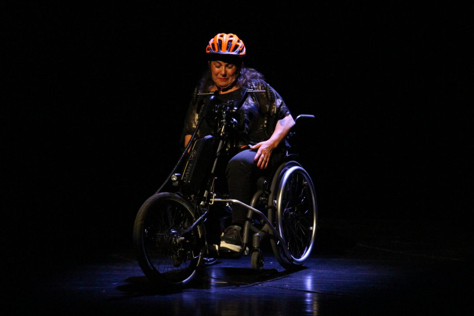 Anlatı ilerledikçe Funda Müjde, kendini tanımlama biçimlerini sahneye getirdi: büyük dedesinin Suriyeli oluşu, ailesinin Adana’dan Hollanda’ya göç etmesi, birden fazla yere ait olma hâli. “Kimlikler karışıktır,” diyor Funda Müjde. Bu anlatı, kökenler ve aidiyetler arasında dolaşırken, bir noktada “sakat” kelimesini özellikle seçerek duruyor. Çünkü onun otobiyografisinde fiziksel kayıp, kimliklerin yerine geçiyor, hatta onları önemsizleştiren bir gerçekliğe dönüşüyordu. Funda Müjde’nin Amsterdam’dan İstanbul’a yaptığı yolculuk, performansın en çok bilinen ama sahnede en geç açılan hikâyesi. Belden aşağısını kullanamayanlar için özel olarak tasarlanmış bir el bisikletiyle, yaklaşık dört bin kilometrelik bir mesafeyi, doksan gün boyunca elleriyle pedal çevirerek kat ettiğini anlatıyor. Ama bu bir başarı hikâyesinden çok kaybın gündelik hayatta nasıl taşındığını, nasıl mizaha, yalnızlığa, “devam etme” hâline karıştığını gösteren somut bir sahne malzemesine dönüşüyor.
